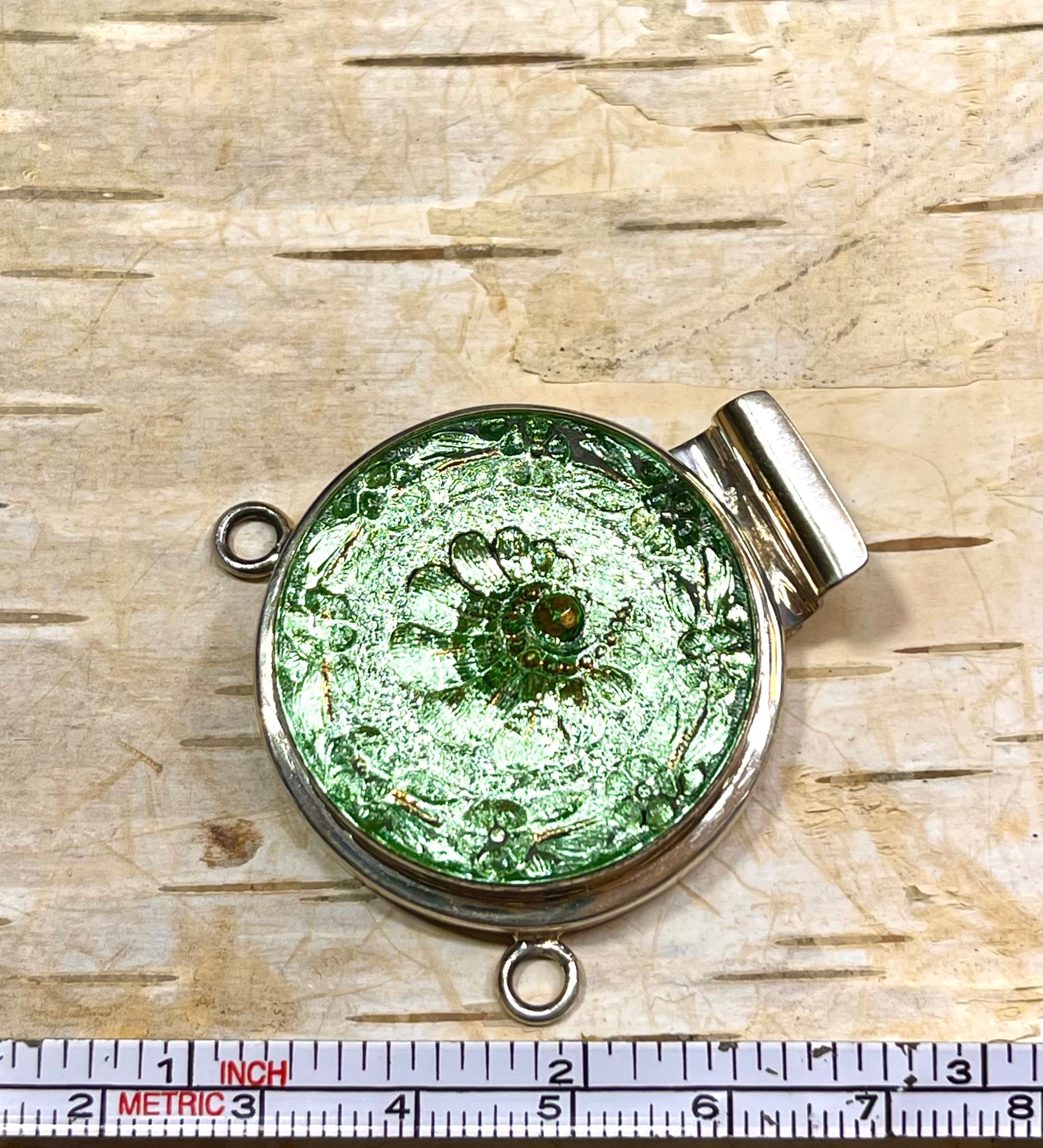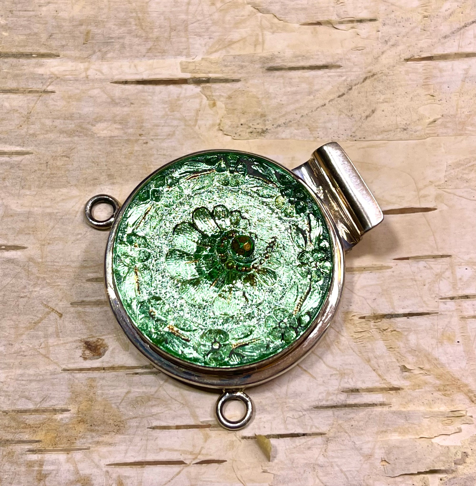 This epic, sterling and antique Czech glass cabachon box clasp is fantastic! The build quality is amazing. Durable and snug fitting, this clasp is not going to pop open or break anytime soon. These are what I call a ‘focal clasp’, it functions as a fastener and also a centerpiece. These clasps were always a limited edition, due to the antique cabochons. The cabochons were made during the Victorian period all the way to the early 1900’s, when ‘paste’ ( glass gems with foiled backs and iridescent finishes due to flamework). These cabs were never in production and look really beautiful! The design could be traced back, if you visited the factory in the Czech Republic, but they haven’t been made in decades. They are truly unique and in wonderful condition.
